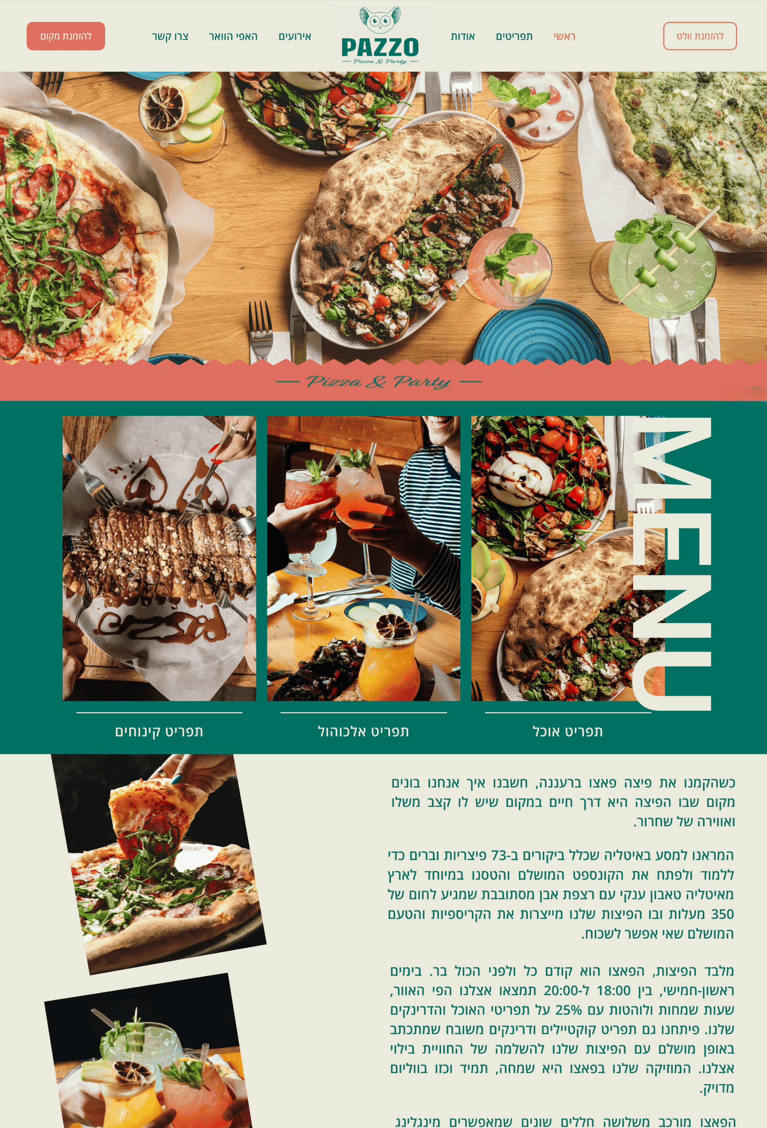 Pazzo הוא בר פיצות צעיר ברעננה עם קוקטיילים מיוחדים, אוכל צבעוני ואווירה חיה. בעיצוב האתר שמתי דגש על חיבור ישיר למיתוג של המקום, דרך צילומי אווירה ואלמנטים גרפיים מהשפה העיצובית הקיימת, שמייצרים חיבור מיידי לאווירה הכיפית שלו. האתר נבנה כעמוד אחד שמרכז בצורה ברורה ונגישה את כל המידע שחשוב לגולש להכיר.